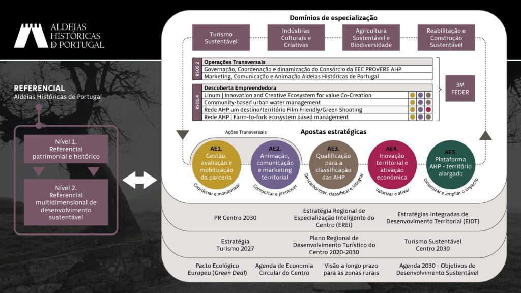 - turismo sustentável: Reforçar o posicionamento da AHP como destino turístico sustentável que se diferencia pela valorização dos seus ativos estratégicos e pela prossecução de uma abordagem integrada de comunicação, animação, qualificação e sustentabilidade do setor, apoiando os agentes económicos (i) na transição para modelos de atuação tendentes à neutralidade carbónica e (ii) mais abertos aos mercados internacionais e, consequentemente, contribuindo para a afirmação Rede AHP como destino de excelência de Turismo Rural (Best Tourism Village).